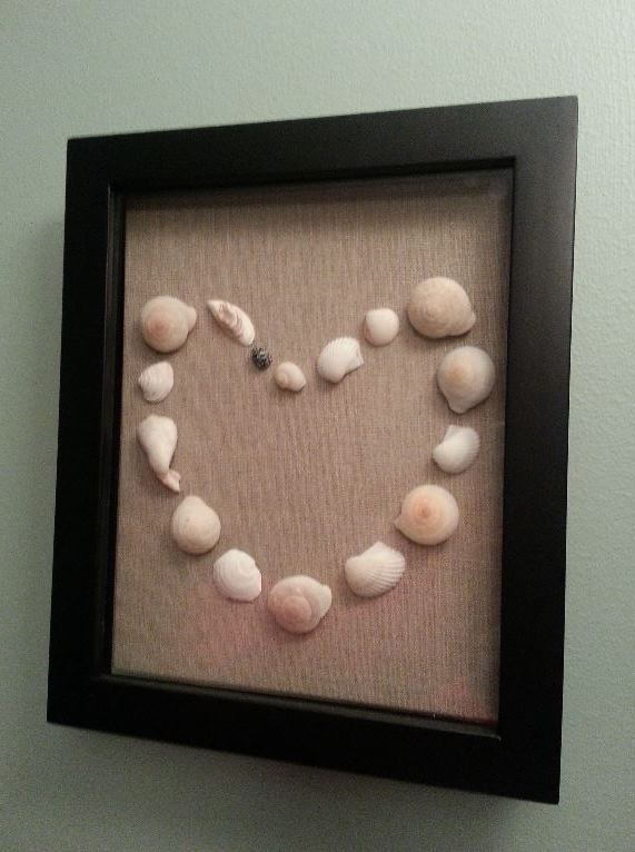 This project was super easy to put together! First, I laid out exactly how I wanted the shells to look in the frame. I decided on a heart outline. After I had a general idea of how the end product would look I placed the linen panel in the shadow box and secured it down to the backing with a little clear tacky craft glue. I then glued each shell down using the same tacky glue in the desired shape and viola! Done! That's it! It was a really simple project but turned out great if I do say so myself. Last but not least it doesn't require cleaning and is a more creative way to display something I love rather than just having them propped up on our dresser.